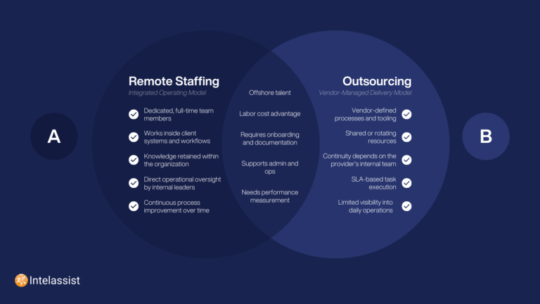 Remote staffing and outsourcing are often grouped together, but they represent distinct operating models with materially different effects on execution, accountability, and long-term performance. While both approaches can involve offshore labor, the way work is structured, managed, and improved over time differs significantly.